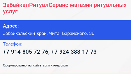 ЗабайкалРитуалСервис, магазин ритуальных услуг по адресу Забайкальский край, Чита, Баранского, 36 в дальнейшем Организация, размещена в следующих категориях: