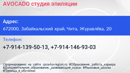 AVOCADO, студия эпиляции по адресу 672000, Забайкальский край, Чита, Журавлёва, 20 в дальнейшем Организация, размещена в следующих категориях:
