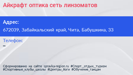 Айкрафт оптика, сеть линзоматов по адресу 672039, Забайкальский край, Чита, Бабушкина, 33 в дальнейшем Организация, размещена в следующих категориях: