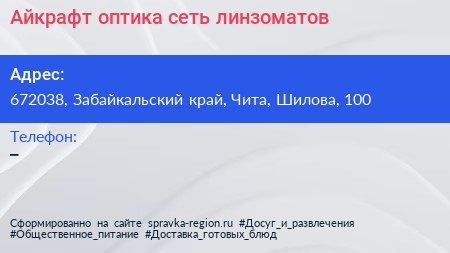 Айкрафт оптика, сеть линзоматов по адресу 672038, Забайкальский край, Чита, Шилова, 100 в дальнейшем Организация, размещена в следующих категориях: