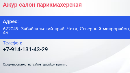 Ажур, салон-парикмахерская по адресу 672049, Забайкальский край, Чита, Северный микрорайон, 46 в дальнейшем Организация, размещена в следующих категориях: