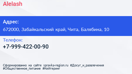 Alelash по адресу 672000, Забайкальский край, Чита, Балябина, 10 в дальнейшем Организация, размещена в следующих категориях: