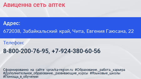 Авиценна, сеть аптек по адресу 672038, Забайкальский край, Чита, Евгения Гаюсана, 22 в дальнейшем Организация, размещена в следующих категориях:
