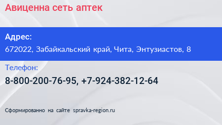 Авиценна, сеть аптек по адресу 672022, Забайкальский край, Чита, Энтузиастов, 8 в дальнейшем Организация, размещена в следующих категориях: