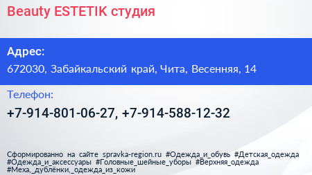 Beauty ESTETIK, студия по адресу 672030, Забайкальский край, Чита, Весенняя, 14 в дальнейшем Организация, размещена в следующих категориях: