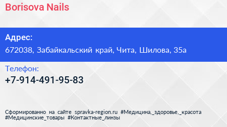 Borisova Nails по адресу 672038, Забайкальский край, Чита, Шилова, 35а в дальнейшем Организация, размещена в следующих категориях: