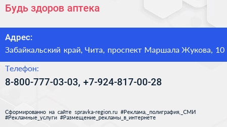 Будь здоров!, аптека по адресу Забайкальский край, Чита, проспект Маршала Жукова, 10 в дальнейшем Организация, размещена в следующих категориях: