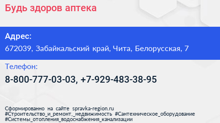 Будь здоров!, аптека по адресу 672039, Забайкальский край, Чита, Белорусская, 7 в дальнейшем Организация, размещена в следующих категориях: