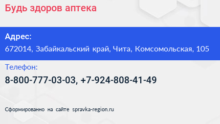 Будь здоров!, аптека по адресу 672014, Забайкальский край, Чита, Комсомольская, 105 в дальнейшем Организация, размещена в следующих категориях: