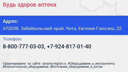 Будь здоров!, аптека по адресу 672038, Забайкальский край, Чита, Евгения Гаюсана, 22 в дальнейшем Организация, размещена в следующих категориях:
