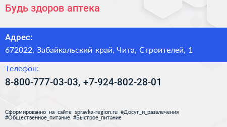 Будь здоров!, аптека по адресу 672022, Забайкальский край, Чита, Строителей, 1 в дальнейшем Организация, размещена в следующих категориях:
