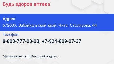 Будь здоров!, аптека по адресу 672039, Забайкальский край, Чита, Столярова, 44 в дальнейшем Организация, размещена в следующих категориях: