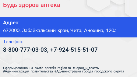 Будь здоров!, аптека по адресу 672000, Забайкальский край, Чита, Анохина, 120а в дальнейшем Организация, размещена в следующих категориях: