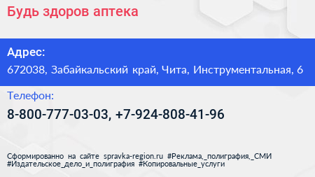 Будь здоров!, аптека по адресу 672038, Забайкальский край, Чита, Инструментальная, 6 в дальнейшем Организация, размещена в следующих категориях: