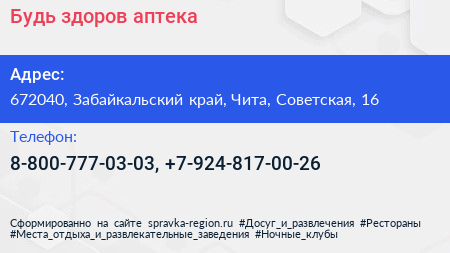Будь здоров!, аптека по адресу 672040, Забайкальский край, Чита, Советская, 16 в дальнейшем Организация, размещена в следующих категориях: