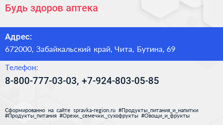 Будь здоров!, аптека по адресу 672000, Забайкальский край, Чита, Бутина, 69 в дальнейшем Организация, размещена в следующих категориях: