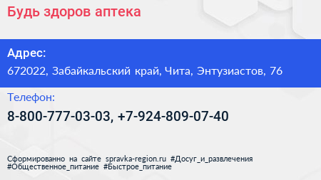 Будь здоров!, аптека по адресу 672022, Забайкальский край, Чита, Энтузиастов, 76 в дальнейшем Организация, размещена в следующих категориях: