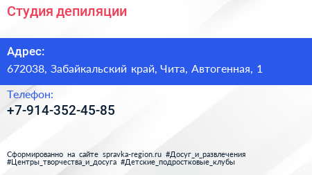 Cтудия депиляции по адресу 672038, Забайкальский край, Чита, Автогенная, 1 в дальнейшем Организация, размещена в следующих категориях: