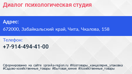 Диалог, психологическая студия по адресу 672000, Забайкальский край, Чита, Чкалова, 158 в дальнейшем Организация, размещена в следующих категориях: