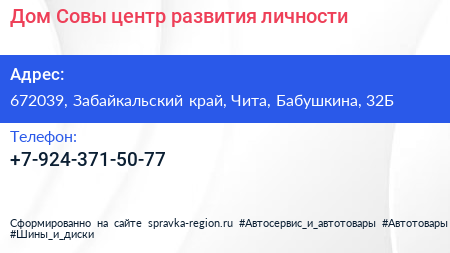 Дом Совы, центр развития личности по адресу 672039, Забайкальский край, Чита, Бабушкина, 32Б в дальнейшем Организация, размещена в следующих категориях: