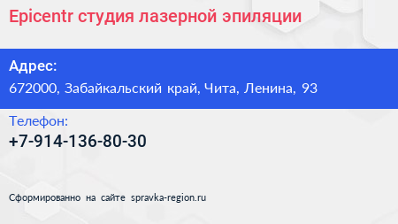 Epicentr, студия лазерной эпиляции по адресу 672000, Забайкальский край, Чита, Ленина, 93 в дальнейшем Организация, размещена в следующих категориях: