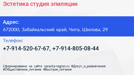 Эстетика, студия эпиляции по адресу 672000, Забайкальский край, Чита, Шилова, 29 в дальнейшем Организация, размещена в следующих категориях: