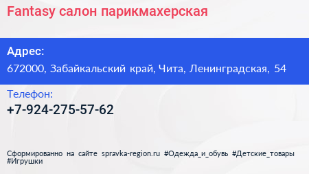 Fantasy, салон-парикмахерская по адресу 672000, Забайкальский край, Чита, Ленинградская, 54 в дальнейшем Организация, размещена в следующих категориях: