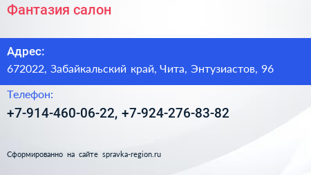 Фантазия, салон по адресу 672022, Забайкальский край, Чита, Энтузиастов, 96 в дальнейшем Организация, размещена в следующих категориях: