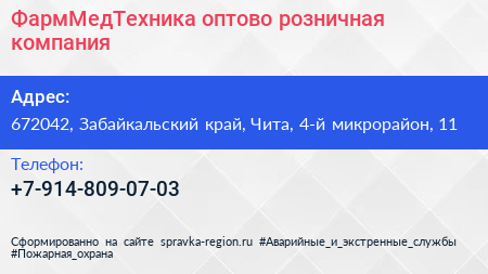ФармМедТехника, оптово-розничная компания по адресу 672042, Забайкальский край, Чита, 4-й микрорайон, 11 в дальнейшем Организация, размещена в следующих категориях: