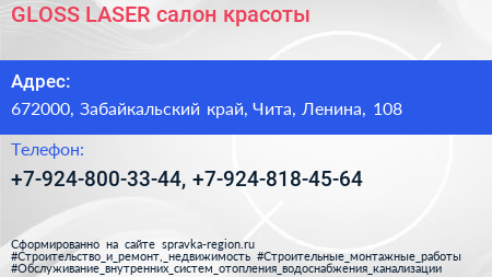 GLOSS LASER, салон красоты по адресу 672000, Забайкальский край, Чита, Ленина, 108 в дальнейшем Организация, размещена в следующих категориях: