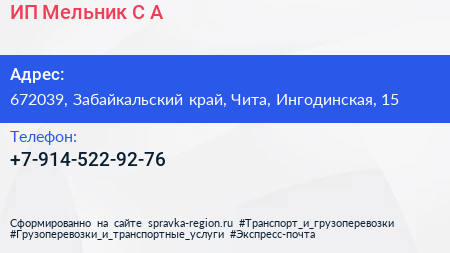 ИП Мельник С.А. по адресу 672039, Забайкальский край, Чита, Ингодинская, 15 в дальнейшем Организация, размещена в следующих категориях: