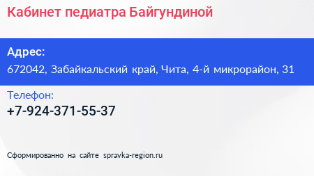 Кабинет педиатра Байгундиной по адресу 672042, Забайкальский край, Чита, 4-й микрорайон, 31 в дальнейшем Организация, размещена в следующих категориях: