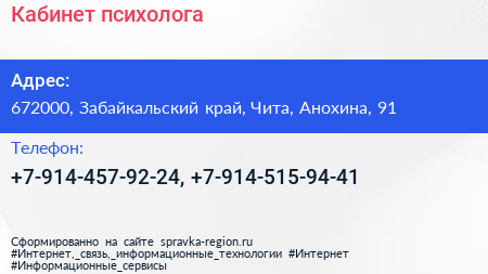 Кабинет психолога по адресу 672000, Забайкальский край, Чита, Анохина, 91 в дальнейшем Организация, размещена в следующих категориях: