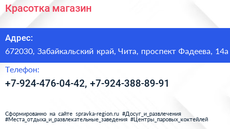 Красотка, магазин по адресу 672030, Забайкальский край, Чита, проспект Фадеева, 14а в дальнейшем Организация, размещена в следующих категориях: