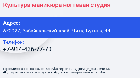 Культура маникюра, ногтевая студия по адресу 672027, Забайкальский край, Чита, Бутина, 44 в дальнейшем Организация, размещена в следующих категориях: