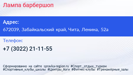 Лампа, барбершоп по адресу 672039, Забайкальский край, Чита, Ленина, 52а в дальнейшем Организация, размещена в следующих категориях:
