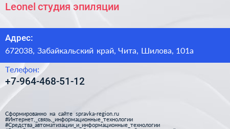 Leonel`, студия эпиляции по адресу 672038, Забайкальский край, Чита, Шилова, 101а в дальнейшем Организация, размещена в следующих категориях: