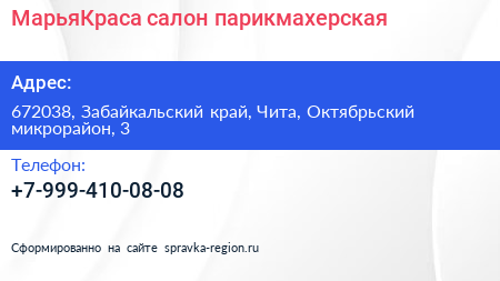 МарьяКраса, салон-парикмахерская по адресу 672038, Забайкальский край, Чита, Октябрьский микрорайон, 3 в дальнейшем Организация, размещена в следующих категориях:
