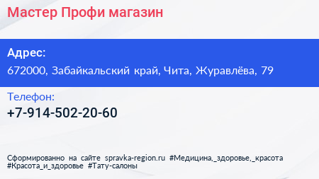 Мастер Профи, магазин по адресу 672000, Забайкальский край, Чита, Журавлёва, 79 в дальнейшем Организация, размещена в следующих категориях: