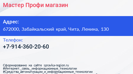 Мастер Профи, магазин по адресу 672000, Забайкальский край, Чита, Ленина, 130 в дальнейшем Организация, размещена в следующих категориях: