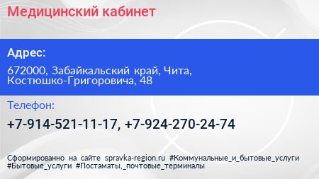 Медицинский кабинет по адресу 672000, Забайкальский край, Чита, Костюшко-Григоровича, 48 в дальнейшем Организация, размещена в следующих категориях: