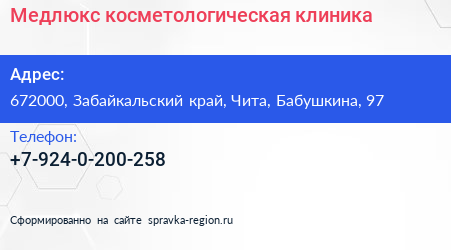 Медлюкс, косметологическая клиника по адресу 672000, Забайкальский край, Чита, Бабушкина, 97 в дальнейшем Организация, размещена в следующих категориях: