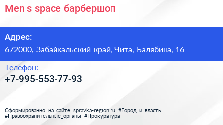 Men`s space, барбершоп по адресу 672000, Забайкальский край, Чита, Балябина, 16 в дальнейшем Организация, размещена в следующих категориях: