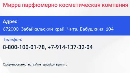 Мирра, парфюмерно-косметическая компания по адресу 672000, Забайкальский край, Чита, Бабушкина, 104 в дальнейшем Организация, размещена в следующих категориях: