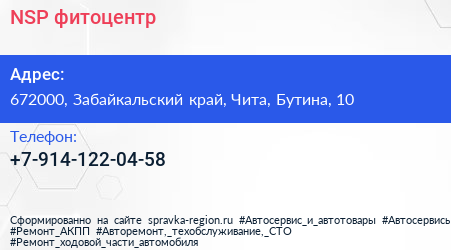 NSP, фитоцентр по адресу 672000, Забайкальский край, Чита, Бутина, 10 в дальнейшем Организация, размещена в следующих категориях: