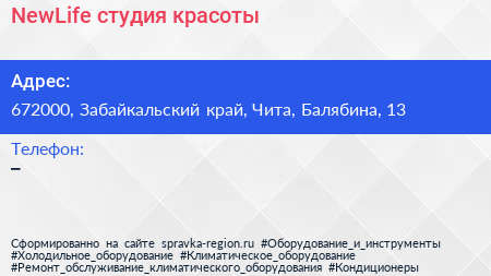 NewLife, студия красоты по адресу 672000, Забайкальский край, Чита, Балябина, 13 в дальнейшем Организация, размещена в следующих категориях: