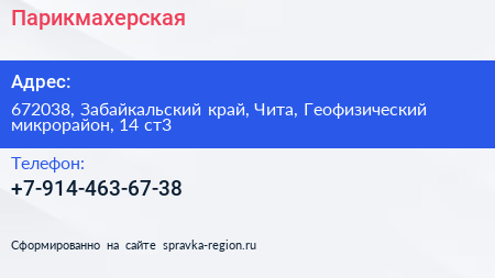 Парикмахерская по адресу 672038, Забайкальский край, Чита, Геофизический микрорайон, 14 ст3 в дальнейшем Организация, размещена в следующих категориях: