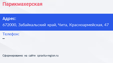 Парикмахерская по адресу 672000, Забайкальский край, Чита, Красноармейская, 47 в дальнейшем Организация, размещена в следующих категориях: