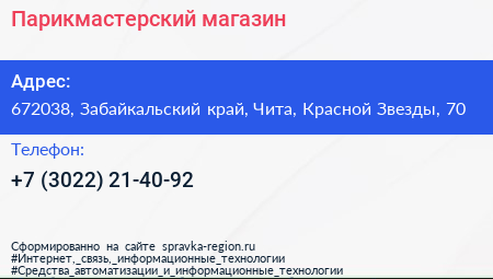 Парикмастерский магазин по адресу 672038, Забайкальский край, Чита, Красной Звезды, 70 в дальнейшем Организация, размещена в следующих категориях: