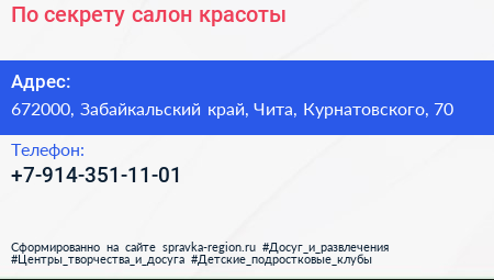 По секрету, салон красоты по адресу 672000, Забайкальский край, Чита, Курнатовского, 70 в дальнейшем Организация, размещена в следующих категориях: